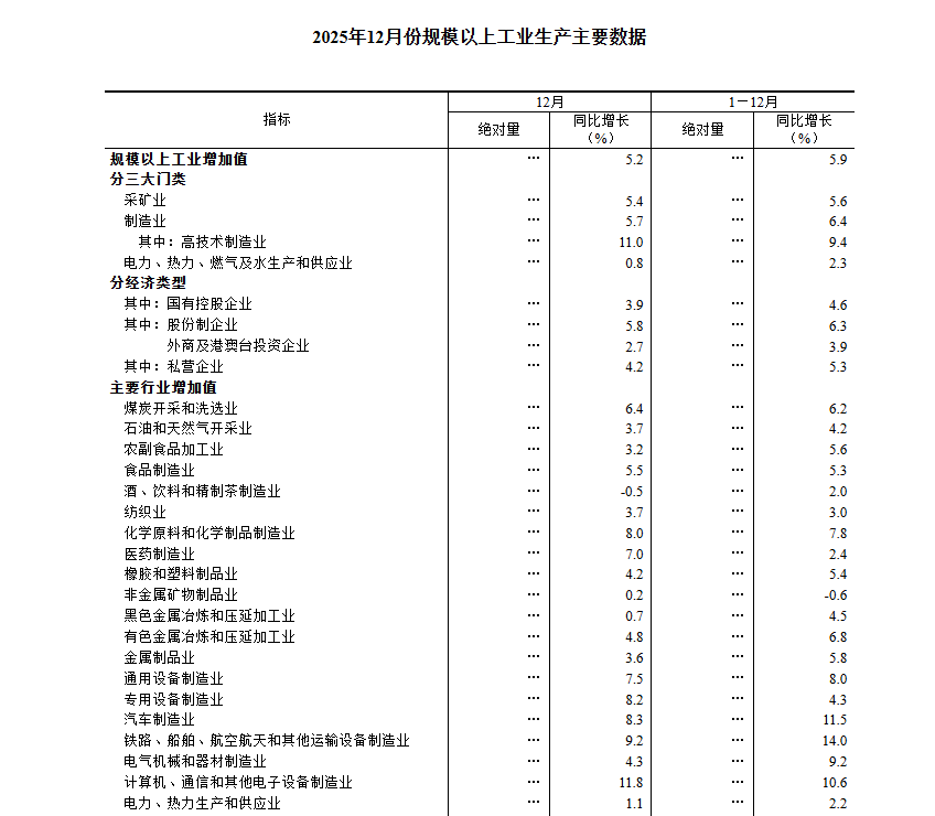 统计局今日公告,2025年12月份,规模以上工业增加值同比实际增长5.2%(增加值增速均为扣除价格因素的实际增长率)。从环比看,12月份,规模以上工业增加值比上月增长0.49%。2025年,规模以上工业增加值比上年增长5.9%。