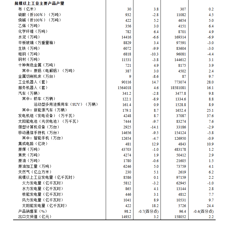 分产品看,12月份,规模以上工业623种产品中有325种产品产量同比增长。其中,钢材11531万吨,同比下降3.8%;水泥14416万吨,下降6.6%;十种有色金属721万吨,增长4.9%;乙烯356万吨,增长3.0%;汽车341.2万辆,下降2.8%,其中新能源汽车179.1万辆,增长8.7%;发电量8586亿千瓦时,增长0.1%;原油加工量6246万吨,增长5.0%。