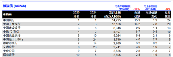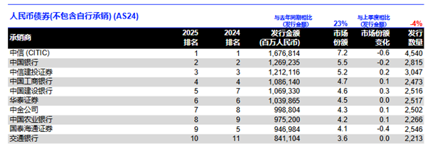 中信(CITIC)领跑人民币债券承销榜单;中国银行在熊猫债承销榜排名第一。