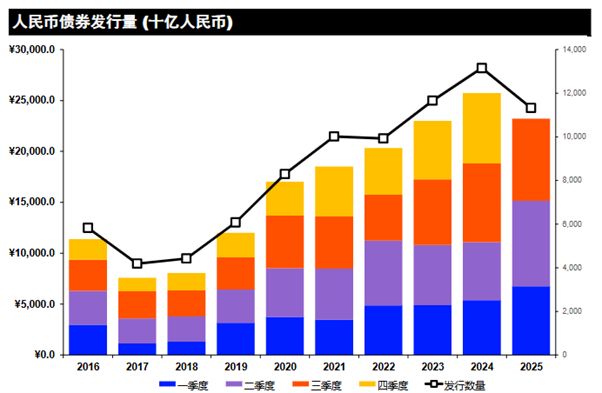 人民币债券市场发行额相比2024年同比增长23%;三季度环比二季度减少4%。熊猫债发行额相比2024年同比减少18%;三季度环比二季度减少6%。