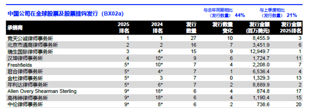 承销商法律顾问榜单中竞天公诚律师事务所位列榜首。