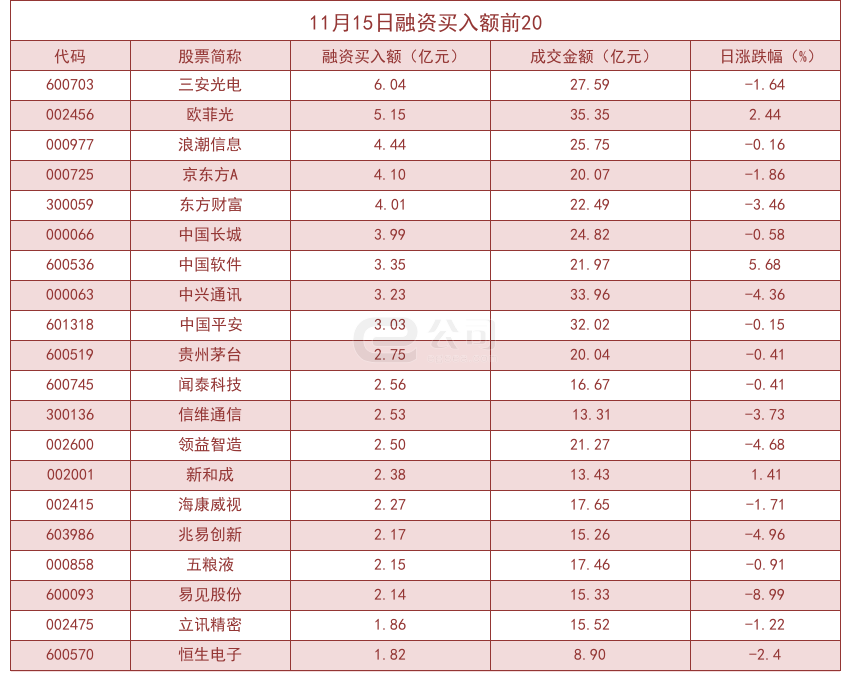 从融资资金买入金额来看,共有59只个股买入金额超亿元,其中三安光电(6.04亿元)、欧菲光(5.15亿元)、浪潮信息(4.44亿元)居前三位。