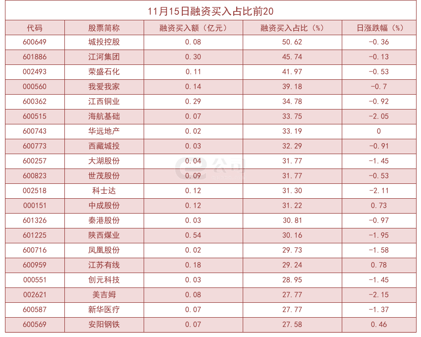 个股方面,沪深两市共有1600只个股有融资资金买入。从融资买入额占当日总成交金额比重来看,共有84只股票融资买入额占比超20%,其中城投控股(50.62%)、江河集团(45.74%)、荣盛石化(41.97%)排名前三。