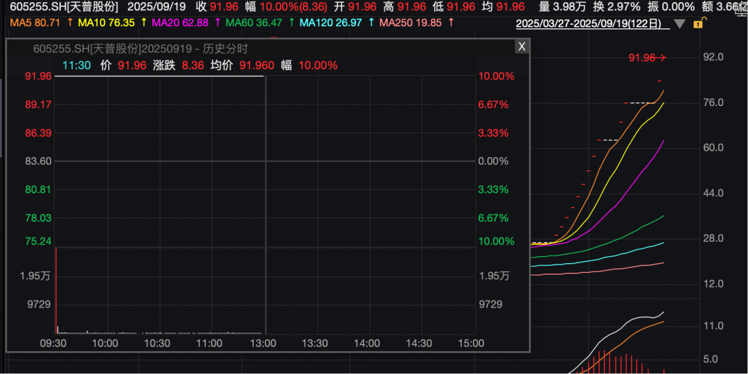 热门个股方面,天普股份今日再度一字涨停,走出13连一字板,报91.96元/股。