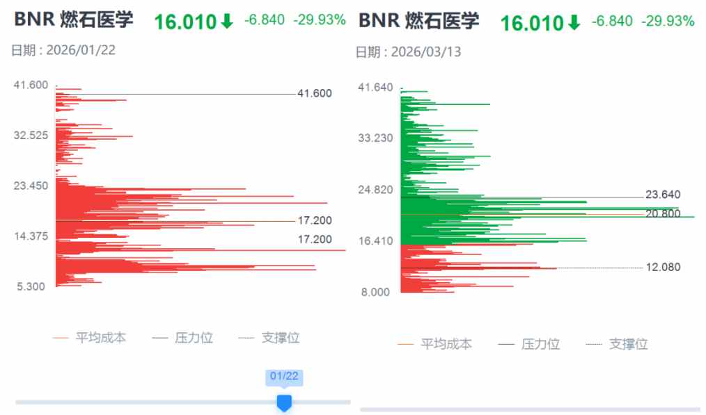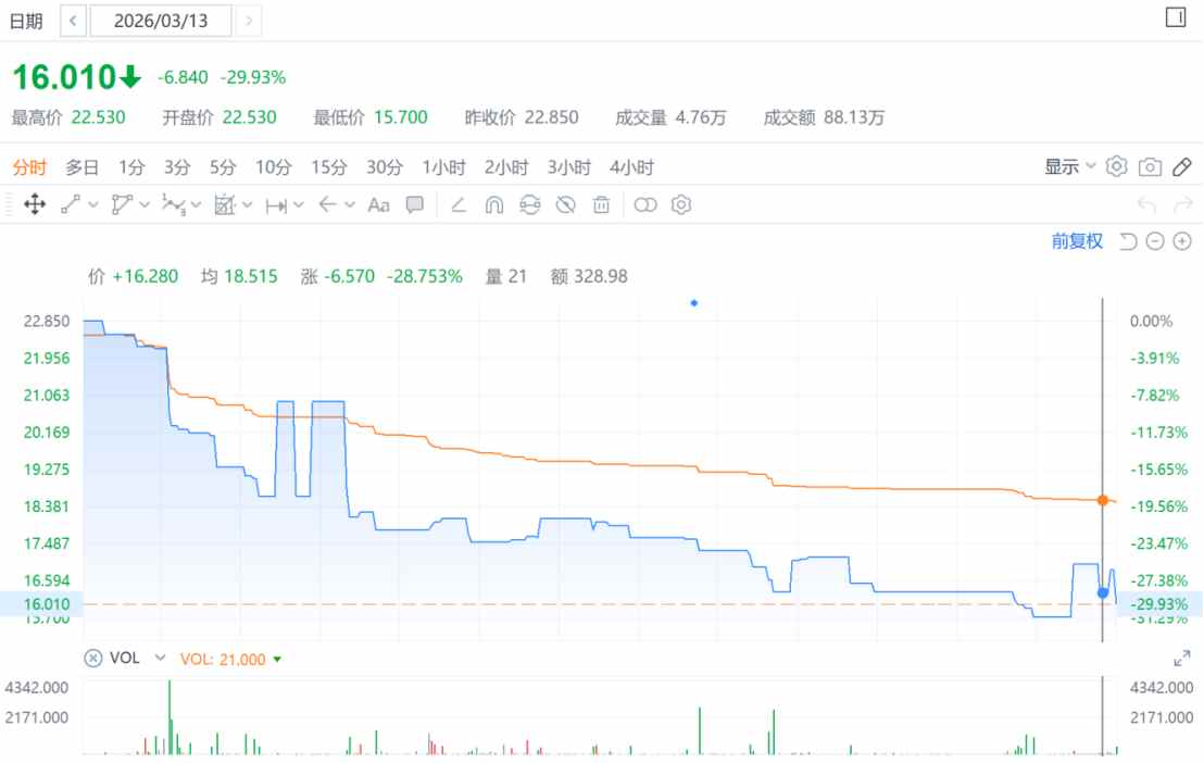 在3月13日盘前发布25Q4财报后,燃石医学股价便迅速走低,并在半小时后大幅跳水,股价迅速下探至日均价线以下,跌幅超过10%,而后虽有2次反弹,但多头势力被连续压制,以致当日早盘后段至收盘,燃石医学盘面基本被空头势力牢牢把控,股价也持续远离日均价线,最后收跌29.93%。