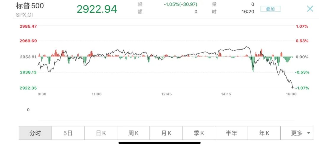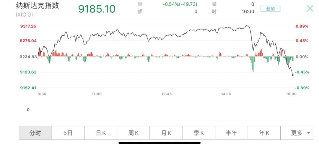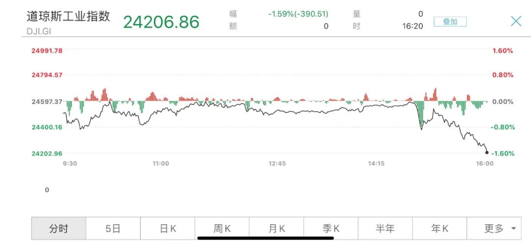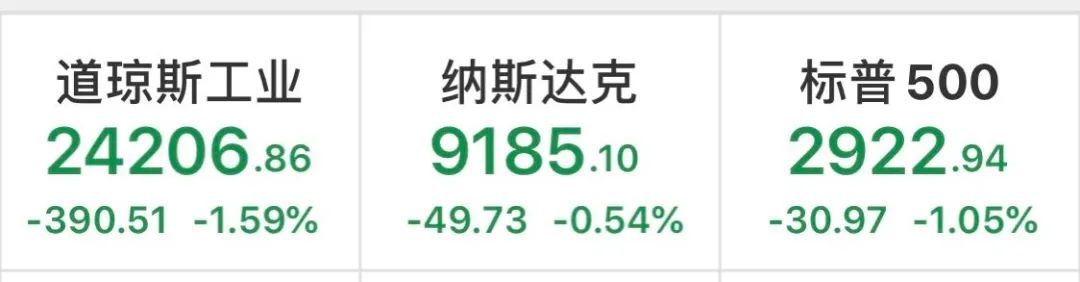 美东时间周二,美股三大股指尾盘跳水,集体收跌。道指结束3连涨,跌近400点。截至收盘,道指跌390.51点,跌幅1.59%,报24206.86点;纳指跌49.73点,跌幅0.54%,报9185.10点;标普500指数跌30.97点,跌幅1.05%,报2922.94点。