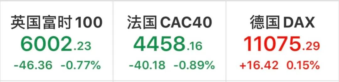 欧股方面,富时100指数报6002.23点,跌46.36点,跌幅0.77%;法国CAC40指数报4458.16点,跌40.18点,跌幅0.89%;德国DAX指数报11075.29点,涨16.42点,涨幅0.15%。