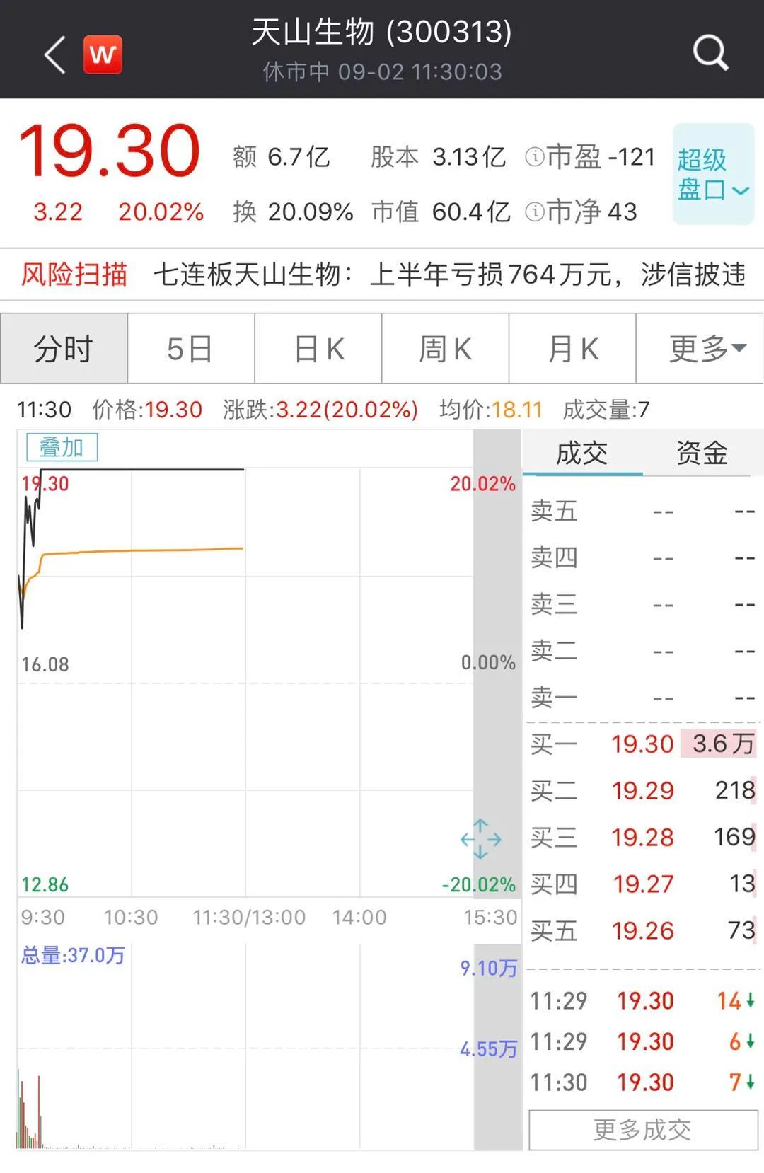 早上开盘,天山生物股价便高开近8%,短暂回落后,便再度“火箭”拉升。9:42,天山生物再度涨停,截至午间收盘,该股成交额超过6亿元,仍有超3.6万手封单。