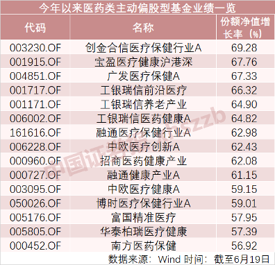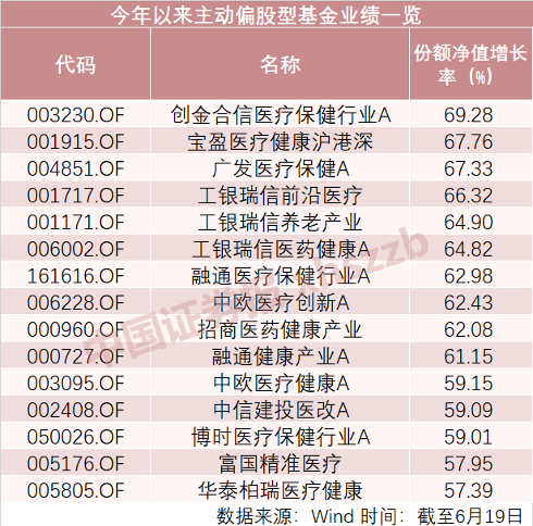 截至6月19日,Wind数据显示,主动偏股型基金中,创金合信医疗保健行业A表现最好,净值增长率69.28%,宝盈医疗健康沪港深、广发医疗保健A的表现也不错,净值增长率分别为67.76%和67.33%。