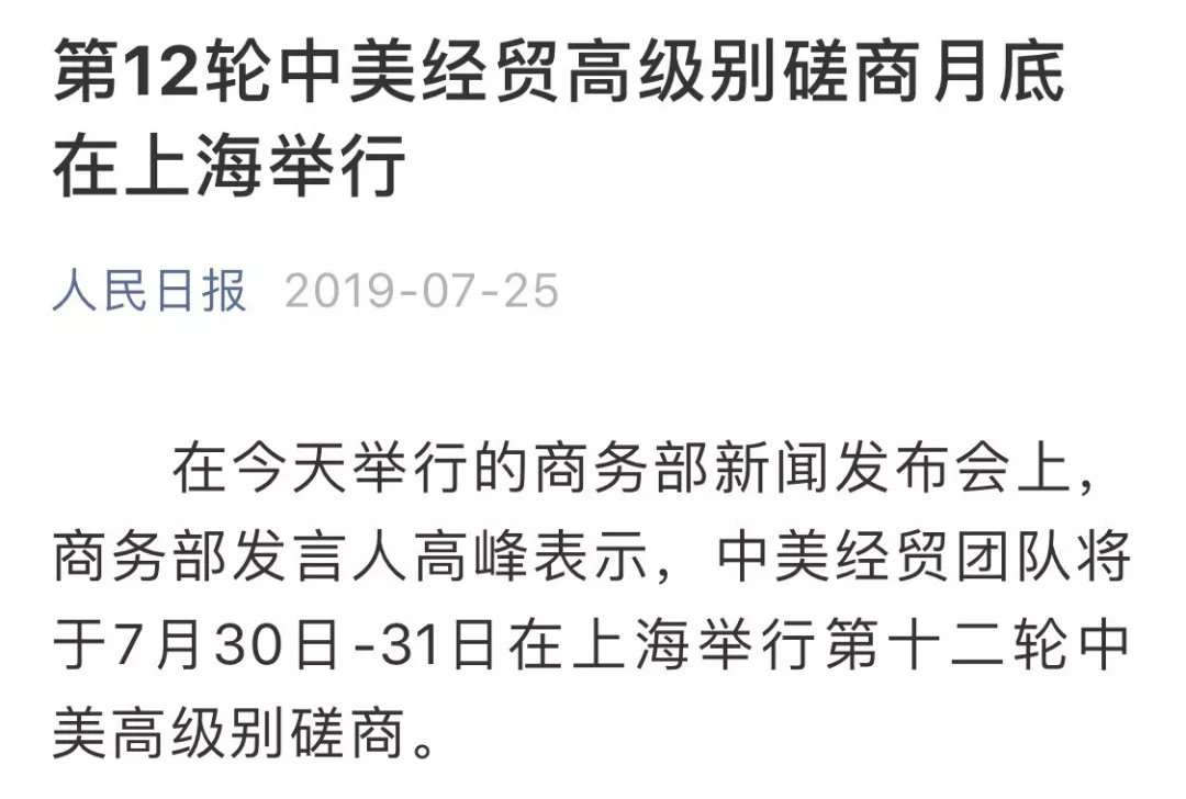 商务部发言人高峰刚刚在新闻发布会上表示,为落实两国元首大阪会晤达成的共识,中美双方牵头人将于7月30-31日在中国上海见面,在平等和相互尊重的基础上举行第十二轮中美经贸高级别磋商。