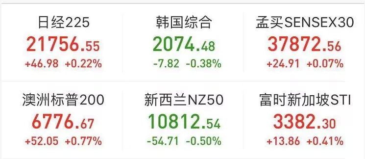 港股市场方面,恒指早盘高开,截至收盘,港股恒指涨0.25%;国企指数涨0.66%;红筹指数涨0.49%。亚太股市方面,日经225指数上0.22%,韩国综合指数下跌0.38%,孟买SENSEX30指数上涨0.12%。