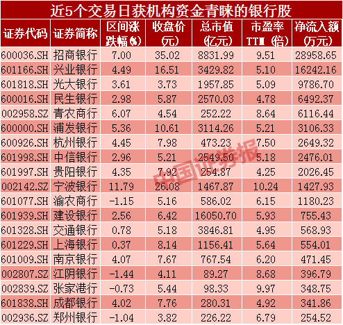 从资金面来看,招商银行最受机构资金青睐,近5个交易日累计净流入2.90亿元;兴业银行居次,净流入额为1.62亿元;其余净流入额较高的还有光大银行、民生银行、青农商行和浦发银行,均在3000万元以上。