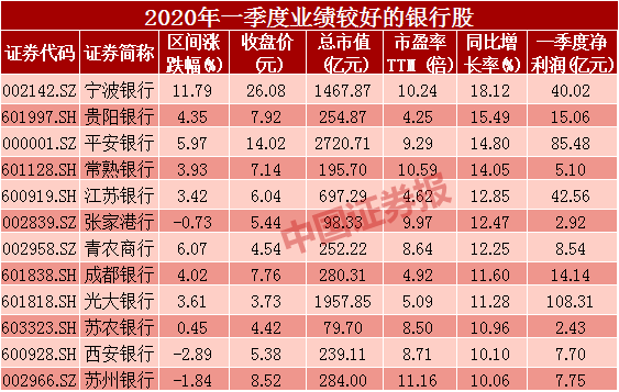 从业绩来看,目前有27家银行披露了2020年一季报。按归母净利润同比计算,26家实现增长。其中,宁波银行增长率最高,一季度净利润40.02亿元,同比增幅18.12%;贵阳银行一季度实现净利润15.06亿元,同比增长15.49%。另有平安银行、常熟银行、江苏银行和张家港行等多股增长率也较高,均在10%以上。