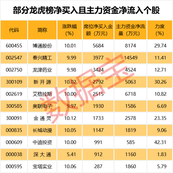 从盘口资金流向来看,主力资金净流入超千万且龙虎榜净买入个股共有10只,其中春兴精工、博通股份、艾格拉斯等个股资金净流入金额最大。净流入力度最大的个股有中迪投资、新开源、博通股份,净流入力度分别为42.31%、30.26%、29.74%。