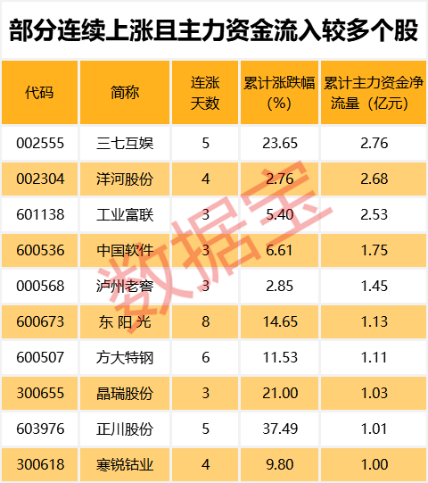 值得注意的是,266只连续上涨个股中,9只个股期间主力资金累计净流入超过亿元。其中,累计资金流入最多的为三七互娱,主力资金累计流入2.76亿元。