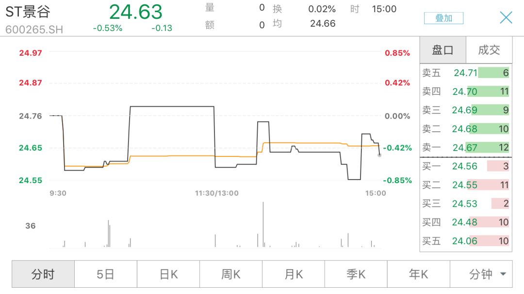 成交金额最低的ST景谷仅成交78.72万元,当天该股开盘十分钟仅成交2笔,且均只有1手,成交金额均只有0.2万元。在10:29至11:29期间,ST景谷价格丝毫未动,中间有近半小时未成交1笔。从全天股价走势来看,ST景谷俨然心电图走势。