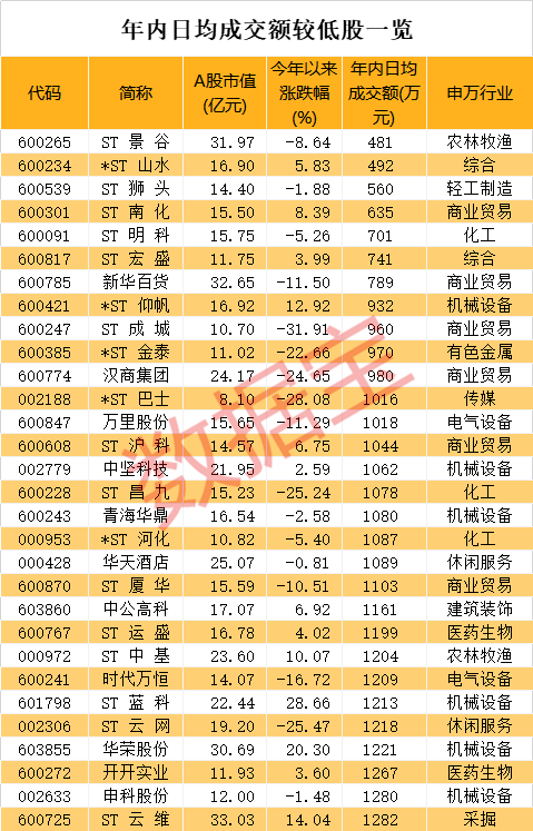 ST景谷年内日均成交额最低,仅481万元,今年前三季度公司净利润亏损649万元,年内股价累计跌幅8.64%。非ST股中,新华百货年内日均成交额最低,仅789万元。今年前三季度,新华百货实现盈利1.71亿元,同比增长3.8%。除新华百货外,日成交额较低的非ST股还有汉商集团、万里股份、中坚科技、青海华鼎、华天酒店等。
