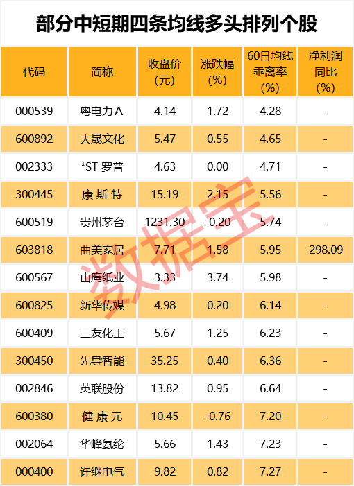 截至最新,两市有112只个股5日、10日、20日、60日四条均线近日呈多头排列。其中粤电力A、大晟文化、*ST罗普股价与60日均线的乖离率最小,分别为4.28%、4.65%、4.71%。