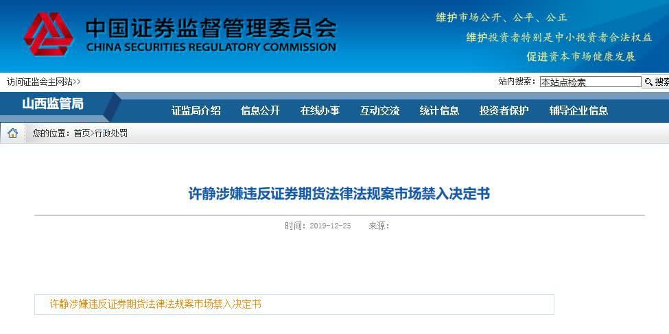 山西证监局表示,自宣布决定之日起,在禁入期间内,除不得继续在原机构从事证券业务或者担任原上市公司、非上市公众公司董事、监事、高级管理人员职务外,许静也不得在其他任何机构中从事证券业务或者担任其他上市公司、非上市公众公司董事、监事、高级管理人员职务。