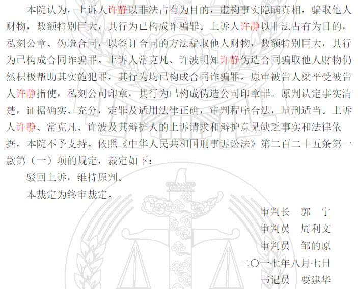 2017年8月7日,山西省高级人民法院作出《刑事裁定书》,认定许静骗取他人财物,数额特别巨大,其行为构成诈骗罪和合同诈骗罪,判处无期徒刑,剥夺政治权利终身,并处没收个人全部财产。