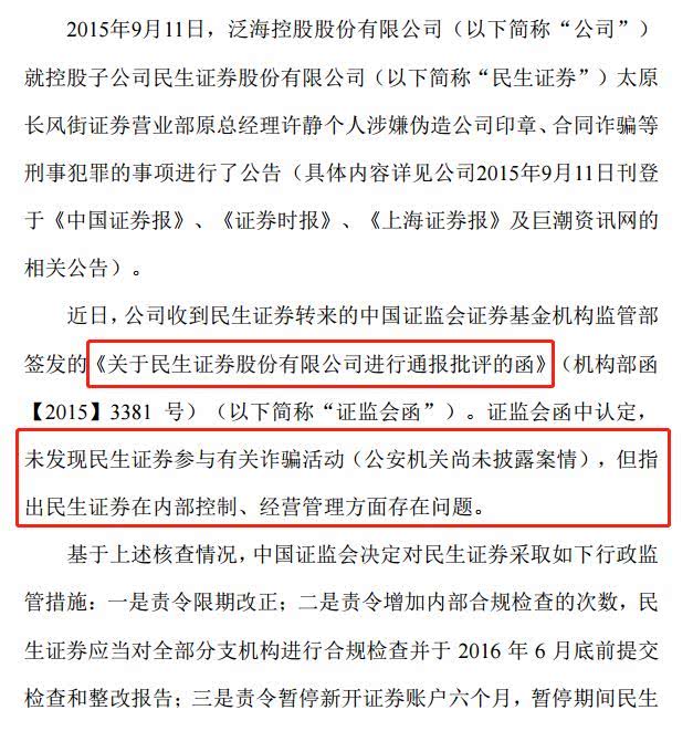 不过,尽管如此,民生证券也并未能独善其身。2016年1月6日,其控股股东泛海控股发公告称,公司收到民生证券转来的中国证监会证券基金机构监管部签发的《关于民生证券股份有限公司进行通报批评的函》。