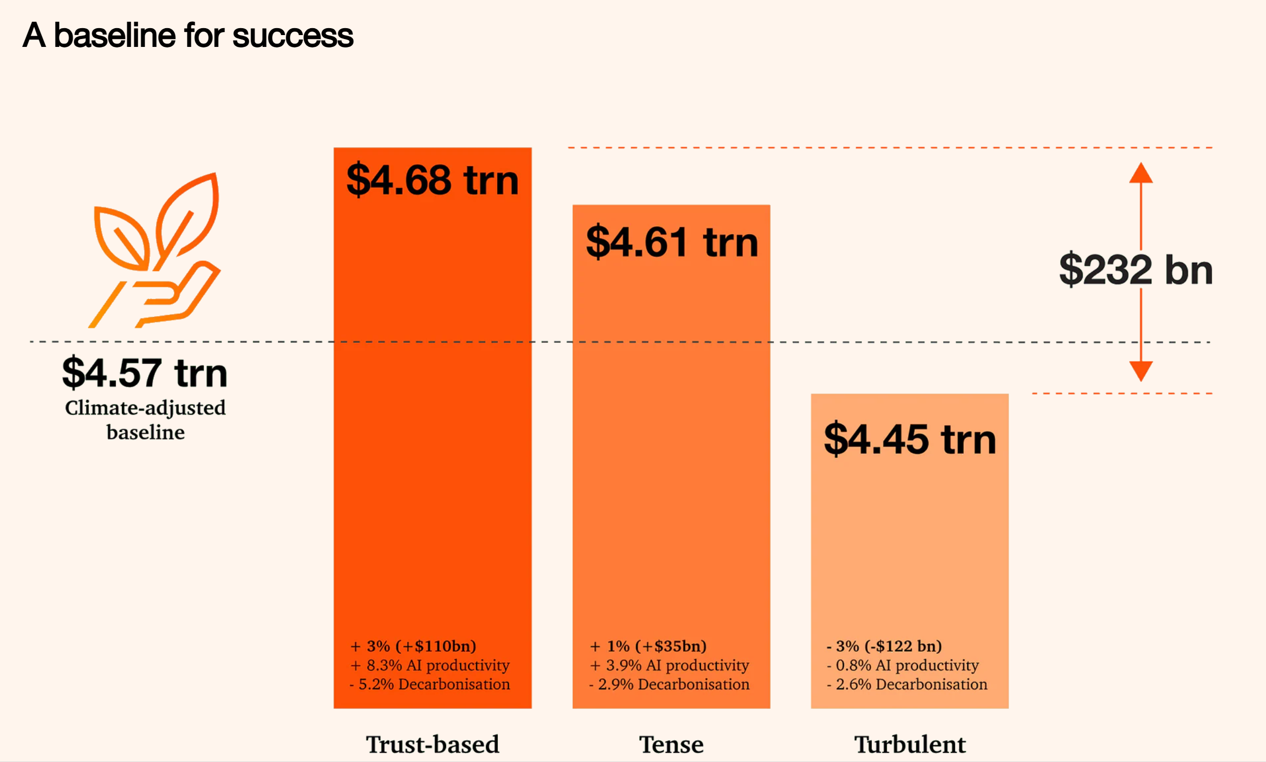 按照报告模型显示,基本情境为2035年该地区GDP将达4.61万亿美元。而最乐观的情况下,若大规模应用人工智能技术与执行气候管理行动,到2035年该地区可以将GDP提高到4.68万亿美元。如果考虑到热浪、水资源短缺和洪水等气候风险,预计GDP将降至4.57万亿美元。