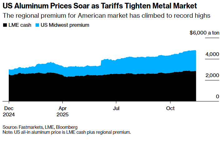 消费者和大宗商品交易员们将这一市场形容为供需几乎“彻底失灵”,附加费则是特朗普关税政策在多深程度上扰乱其供需结构的最新同时也是最清晰的信号。包括LME基准价和中西部溢价在内的美国到岸铝价上周在库存大幅减少的背景下创下历史纪录。