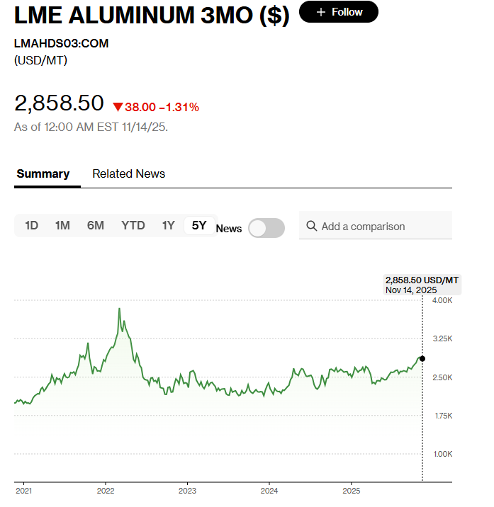 在美国总统唐纳德·特朗普今年早些时候对这种轻质金属征收高达50%的进口关税之后,这项新的附加费无疑令本已极度吃紧的美国市场承压更重。这种金属广泛应用于从汽水罐到建筑再到近期如火如荼的AI数据中心建设等各个领域。特朗普关税政策令加拿大发往美国的铝对美国金属加工商和消费者们来说变得过于昂贵。相应地,他们转而大举动用紧张的国内库存以及交易所仓库资源,结果导致铝供应持续减少并且美国铝交易价格持续上涨。