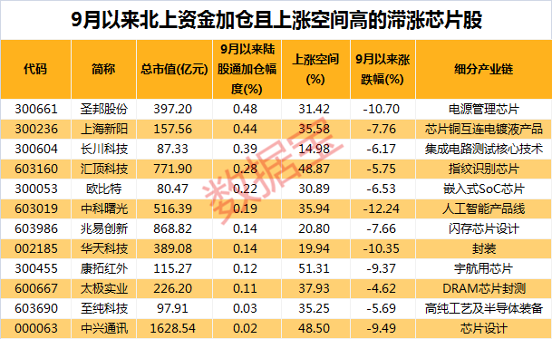 梳理发现,芯片股年内整体表现较好,但9月以来普遍回调,这与美国的打压有一定关系。数据宝统计显示,9月以来跑输大盘且获北上资金加仓,股价上涨空间超10%的芯片股仅有12只,包括市值超千亿的中兴通讯、超850亿的兆易创新等。