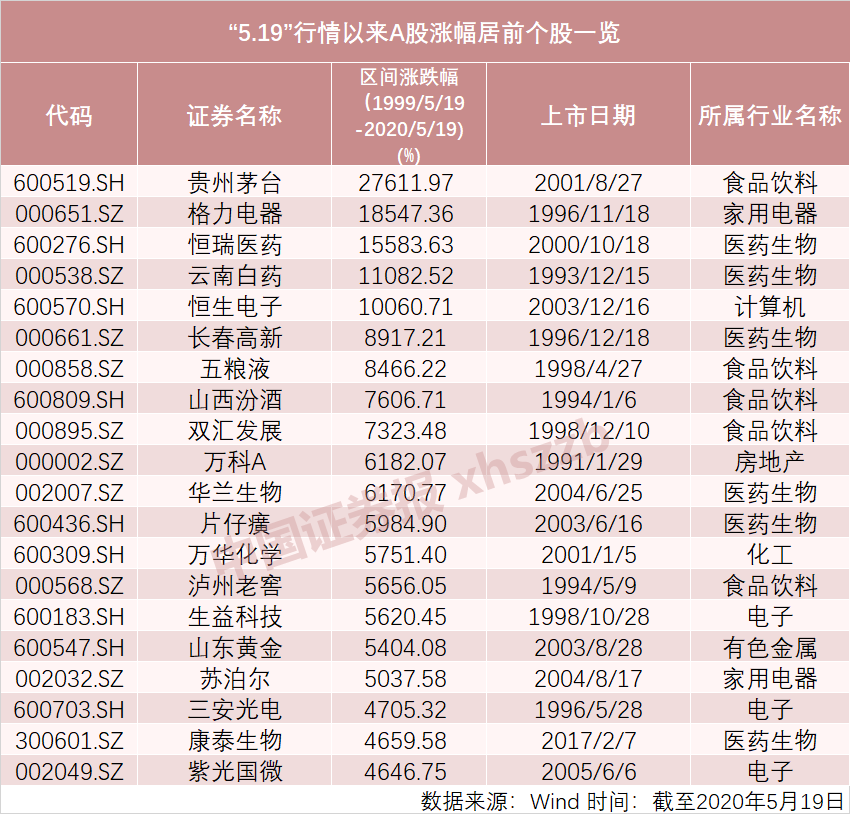 “5·19”行情值得怀念,但21年来A股早已牛股辈出。1999年5月19日至今,A股最牛个股是贵州茅台,今日收盘价1346.11元,从2001年上市以来涨幅达276倍。