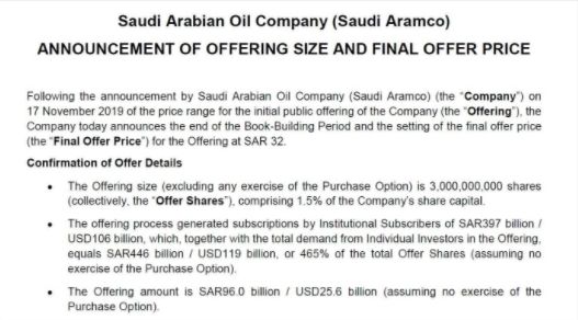 中东石油巨鳄来了,沙特阿美IPO价格正式公布!其融资规模一举超越阿里,成为全球有史以来最大规模IPO。