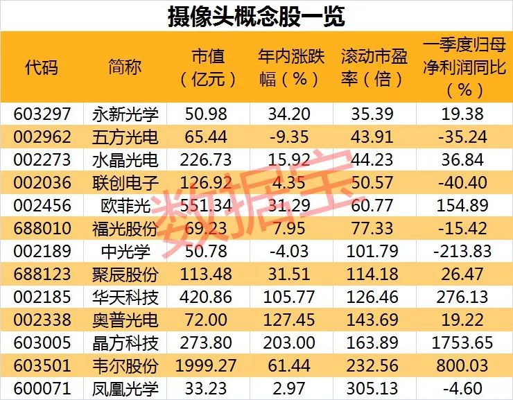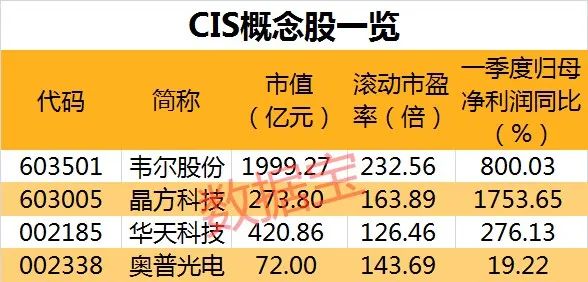 A股上市公司中,CIS概念股比较稀缺。证券时报·数据宝统计显示,具体的上市公司有晶方科技、韦尔股份、华天科技和奥普光电。
