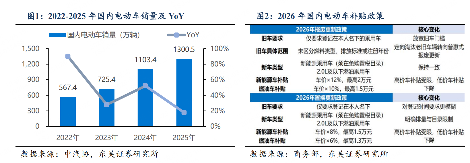 26年国内电动车补贴延续,我们预计本土新能源车销量1460万辆,同比+5.2%。