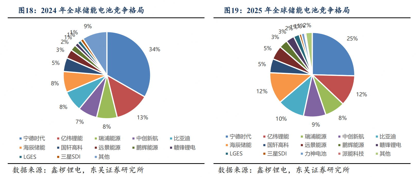 25年,宁德储能电池份额为25%,同比-9pct。二线厂商及部分新兴厂商份额提升较快,亿纬锂能、瑞浦兰钧、中创新航、比亚迪、海辰储能、国轩高科、远景能源25年份额为12%/8%/9%/10%/12%/5%/5%,同比-1pct/+0pct/+1pct/+3pct/+4pct/+0pct/+2pct。随着26年宁德储能扩产加速,份额有望强势回归。