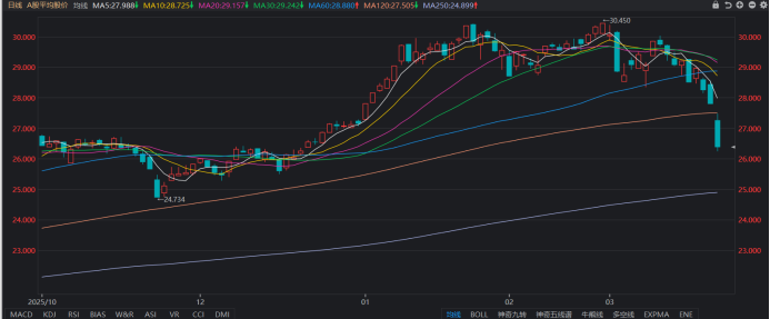 今日(3月23日),市场再度跌多涨少,截至收盘,上涨股数量仅300余只。受此影响,A股平均股价(算术平均)继续回落,报收26.4元,创年内新低,同时较2月底时录得的高点累计回撤近13%。
