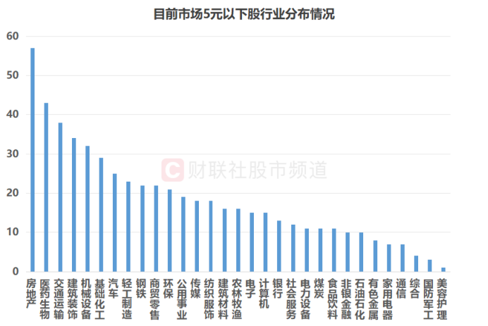 从低价股的分布上看,目前5元以下股主要分布在房地产、医药生物、交通运输、建筑装饰、机械设备、基础化工板块,其占比数量均在5%以上,而美容护理、国防军工、综合、家用电器、通信股数量相对较少。若以细分板块统(申万三级)计,住宅开发、化学制剂、板材、港口、水务及水治理、中药、面板等板块目前5元以下股数量较多。