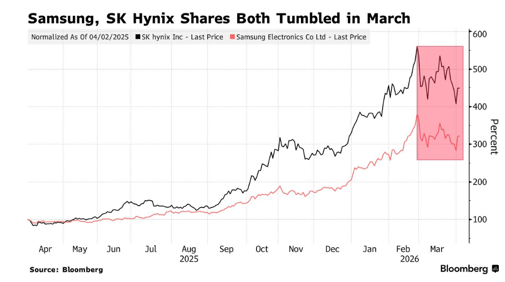 今年3月份,海外投资者净抛售了170亿美元的三星电子和SK海力士股票。这导致三星股价当月下跌23%,SK海力士当月股价下跌24%,均创下自至少2008年以来最大的单月跌幅。