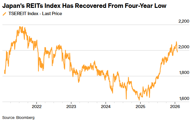 债市的波动抹去了东京证券交易所 REIT 指数今年的涨幅。自 1 月 20 日以来,该指数已下跌 2.5%,而同期东证指数(TOPIX)在债市暴跌后的跌幅为 2%。该房地产信托指数此前曾跌至 2020 年以来的最低点,近期才回升至四年高位。
