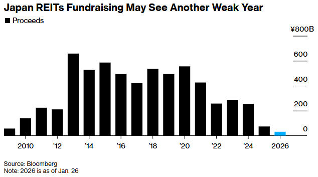 上周日本债市的暴跌正威胁着要进一步抑制房地产投资信托基金(REITs)的融资,而由于融资成本上升,该行业的筹资活动此前已经放缓至停滞状态。