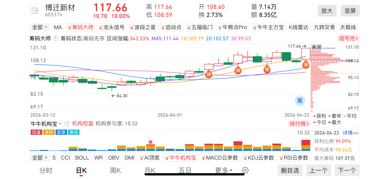 1)20260422-博迁新材-605376-【筹码大师】和【牛牛机构宝】-近期出现弹信号且底部量柱由绿转红