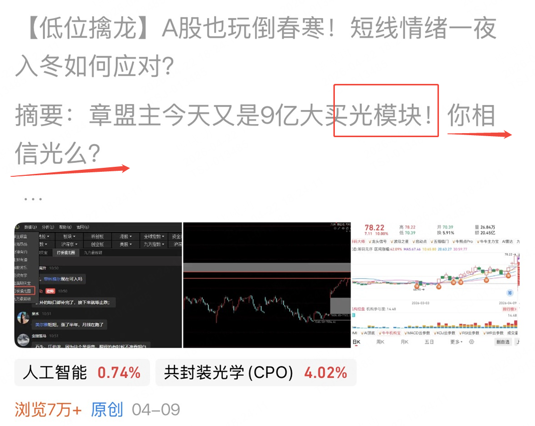 最近跟光模块、CPO、光纤的段子太多了,基本上就是要么站在光里,要么看着光涨。4月9号的文章就在喊光模块一直喊到现在。有的粉丝看我天天喊光模块,问我还能买光模块么?