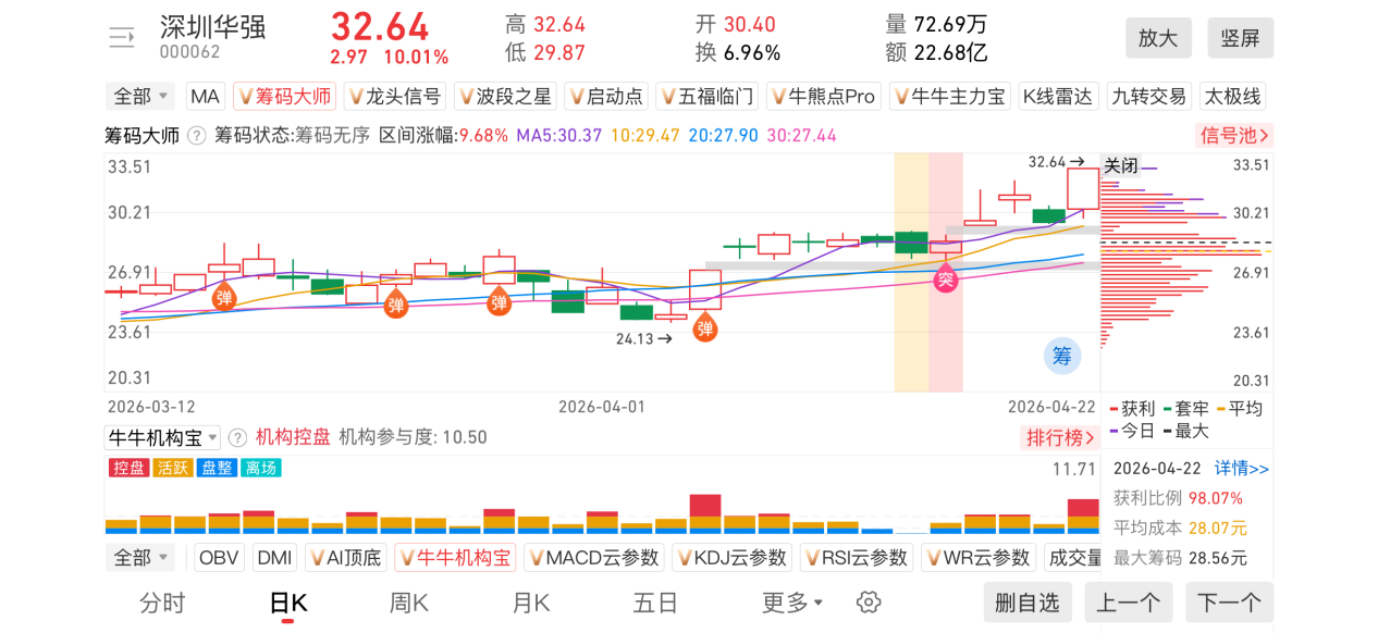 2)20260422-深圳华强-000062-【筹码大师】和【牛牛机构宝】-近期出现弹信号且底部量柱由绿转红