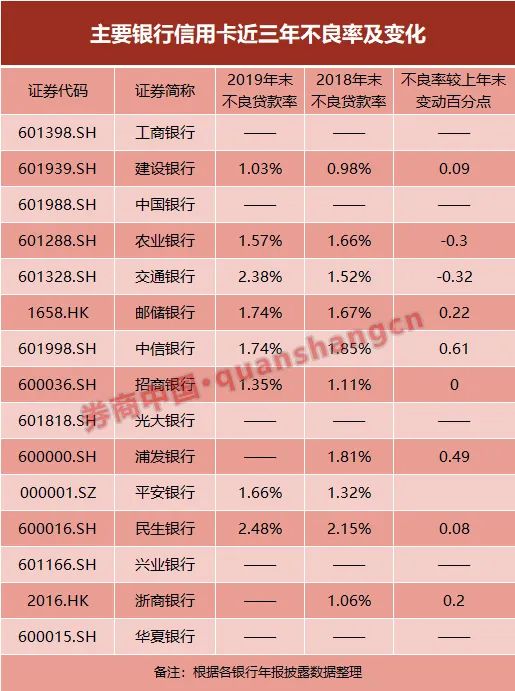 截至2019年末,从年报中披露的银行信用卡不良贷款率看,数家均有上升态势。