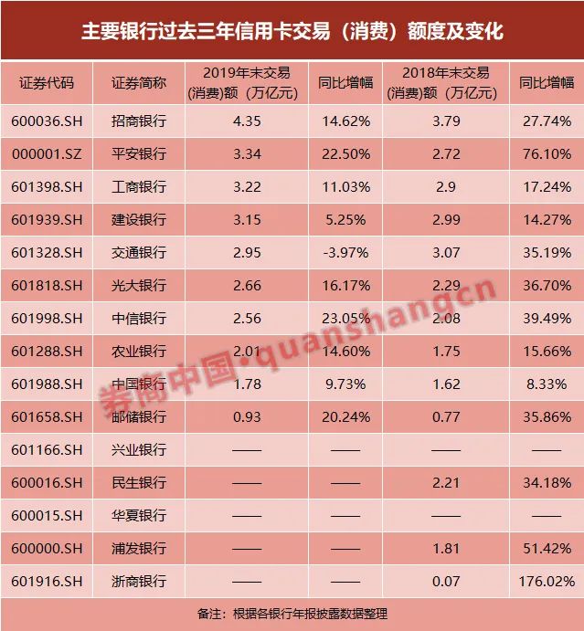 从年报披露情况来看,招行信用卡交易金额达到4.34万亿元、刷新纪录;平安银行以22.5%增速达到3.34万亿元位居二位。其它增长较快的还有中信银行、邮储银行,2019年信用卡交易量2.56万亿元、0.93万亿元,分别较上年增长23.05%、20.24%。此外,在交易规模上,工行、建行也超过了3万亿元。