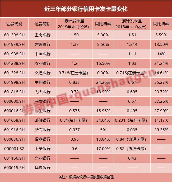 以零售业务见长的招商银行、平安银行在去年新发卡量增速,均明显下降。年报显示,招行2019年新增发卡量(流通卡量)约1100万张,较2018年下降1084万张;平安银行去年新增发卡量880.91万张,较上年下降了436.09万张。