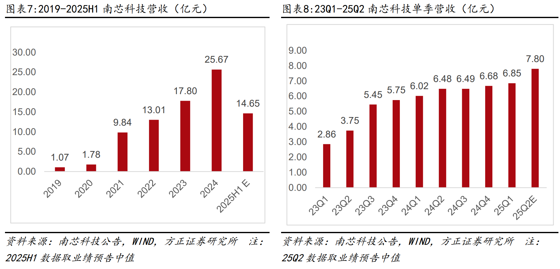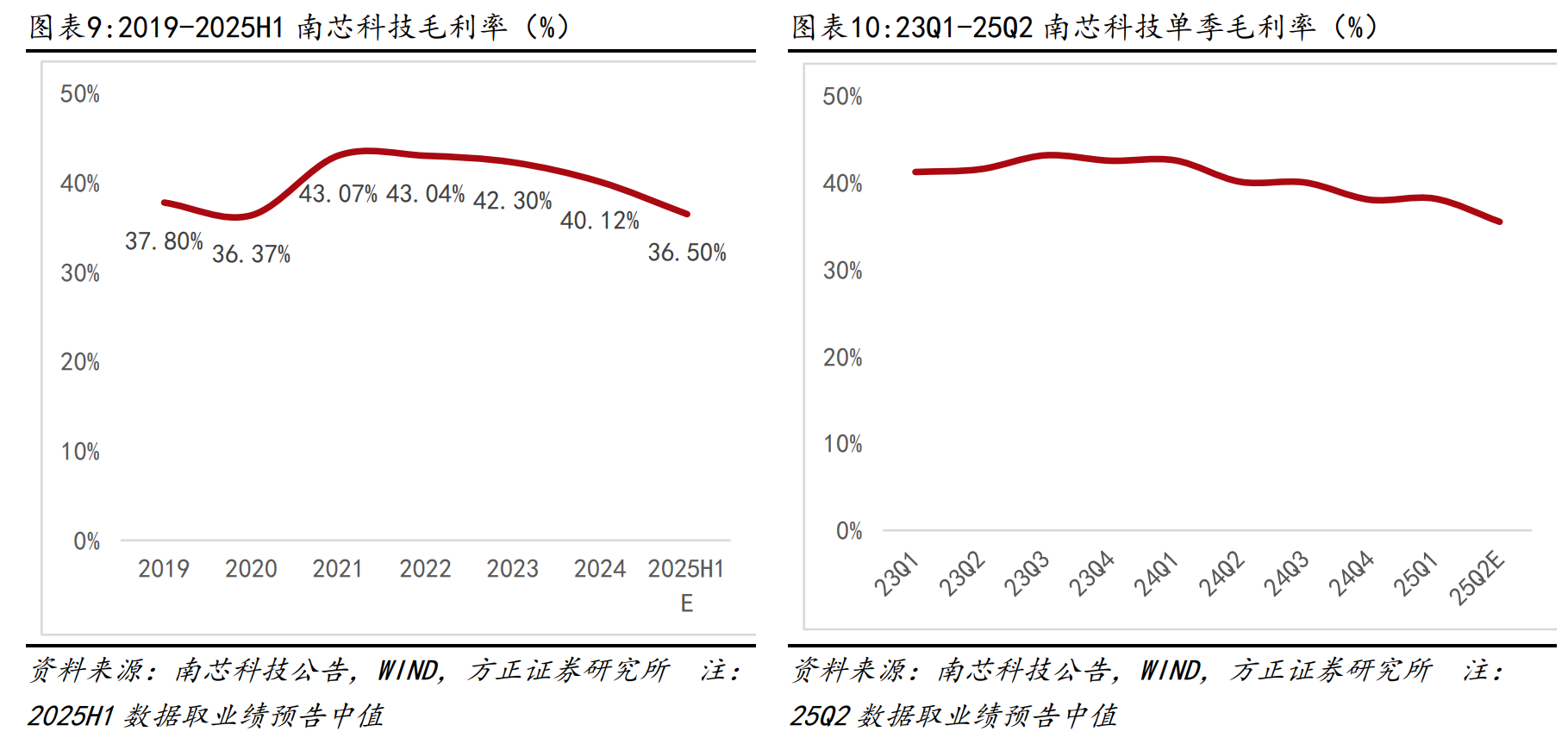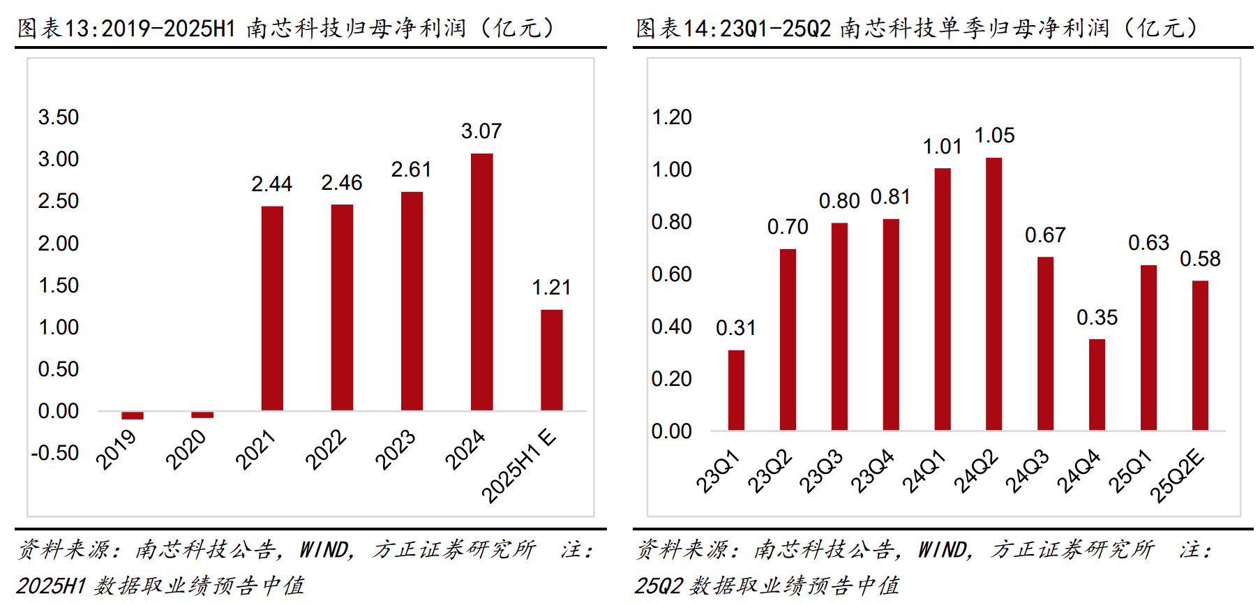 财务数据:景气度持续向好,毛利率有望逐季改善。营收:随着消费市场终端需求的小幅回暖,汽车和工业市场需求复苏,南芯科技新产品逐步起量,市场份额增加使得公司产品销售规模扩大,主营业务稳健增长。公司预计25H1实现营收14.3-15.0亿元,同比增长14.39%-19.99%。单季度看,公司预计25Q2实现营收7.45-8.15亿元,同比增长14.89%-25.69%,环比增长8.69-18.90%。展望25H2,随着消费电子行业传统旺季的到来,以及下游核心客户多款新品的集中发布,公司的产品出货量有望进一步提升。同时,公司在汽车电子、工业等领域的新品导入进度加快,业务结构将更趋多元化,有望推动公司业务规模进一步提升。