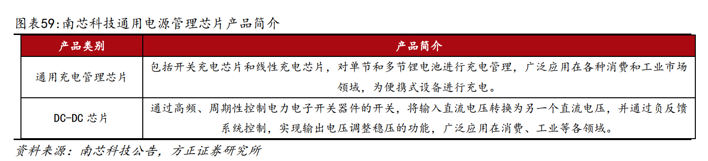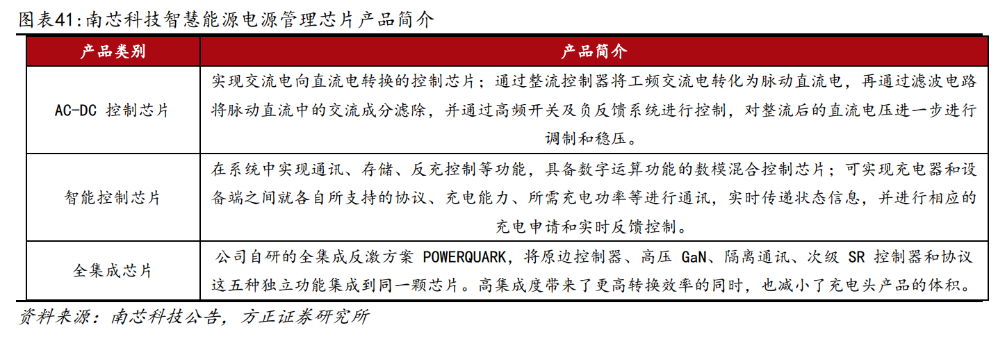 南芯科技围绕锂电池充电管理,以USBPD为切入点,搭建移动设备电源管理芯片(含有线充电管理芯片、无线充电管理芯片、锂电管理芯片、显示电源管理芯片、其他移动设备电源管理芯片)、智慧能源电源管理芯片、通用电源管理芯片和汽车电子芯片四大产品序列。公司不断加强自身在消费电子领域的竞争力,同时汽车电子芯片增长发力,加速重点布局多个工业应用场景的产品,致力于成为全球领先的模拟与嵌入式芯片企业。