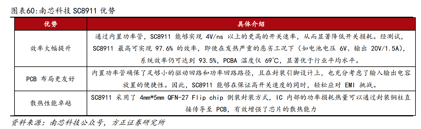 通用电源管理芯片:推出多款充电芯片,积极拓展工业应用市场。南芯科技通用电源管理芯片产品主要包括通用充电管理芯片和DC-DC芯片两大类。开关充电芯片提供升压、降压、升降压三种架构,可对单节和多节电池进行充电和控制。在线性充电芯片领域,公司推出业界第一款TWS直充方案。DC-DC芯片包含通用DC-DC、电荷泵DC-DC和负载开关等产品,其中升降压变换器覆盖从低压到40V中压电压范围,并于2024年推出可应用于显示器、拓展坞、分线器等平台快充功能的集成低边MOSFET高效同步升降压变换器SC8742B和SC8746,进一步强化了南芯科技在140W和100W高功率范围内的产品能力。