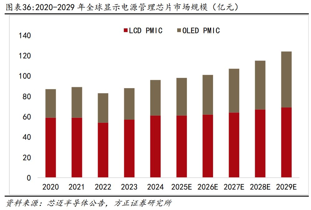 显示电源管理芯片:在显示电源管理芯片领域,南芯科技主要产品为AMOLEDPMIC,通过不同拓扑和不同控制方式的变换器为AMOLED屏幕所需要的不同电源轨提供最合适的解决方案,具有高效率、快速的动态响应、以及宽输入电压范围三大特点。根据芯迈半导体数据,2025年全球OLEDPMIC市场规模预计为37亿元,有望于2029年达到55亿元,2025-2029年CAGR为10.5%。