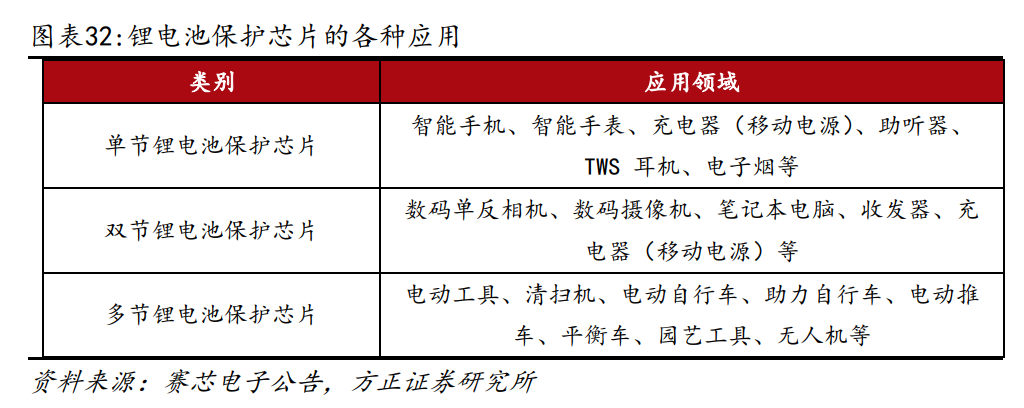用于消费电子产品中的单串电池组,如手机、平板、可穿戴设备等,通常采用单节锂电保护芯片即可实现对整个电池组的保护。一台智能手机需用到1-2颗锂电保护芯片(10V/2A以上充电功率的手机需要用到2颗)。TWS耳机的电池仓及耳机通常各需要1颗锂电保护芯片,即1副TWS耳机通常需要3颗锂电保护芯片。